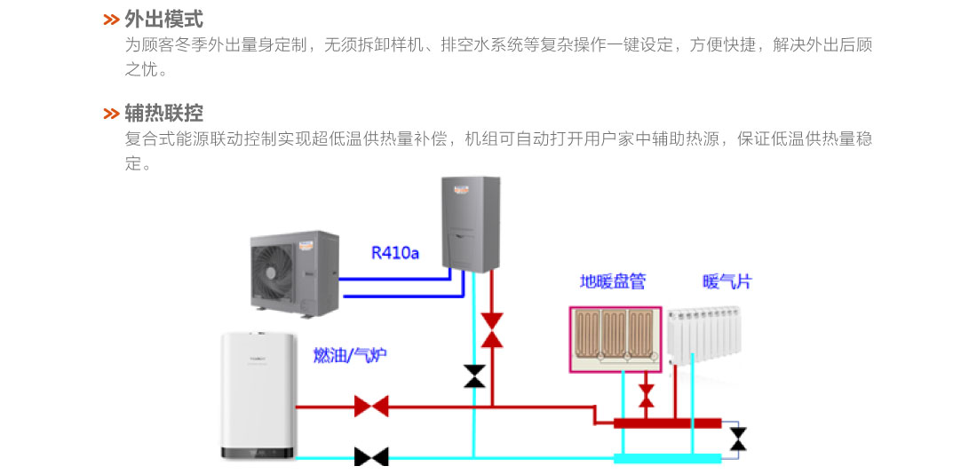 采用直流變頻技術(shù),制熱量范圍8.5~16kW,穩(wěn)定運行環(huán)境溫度范圍-20℃~28℃、出水溫度范圍25~55℃,具有低溫強(qiáng)熱、節(jié)能高效、穩(wěn)定可靠等特點,適用于集中供暖覆蓋不足的農(nóng)村及城郊地區(qū)以及城市獨立供暖的公寓、復(fù)式樓、別墅、單元寫字樓、餐廳、商店、娛樂場所等空間.